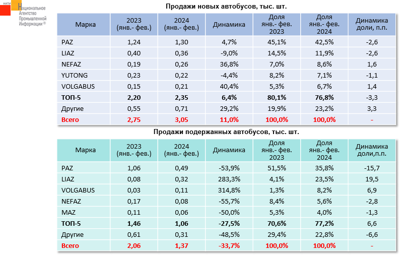 По данным маркетингового агентства НАПИ, продажи новых автобусов за январь-февраль 2024 г. выросли на 11,0%, тогда как спрос на подержанные автобусы упал на 33,7%. На рынке новых и подержанных автобусов лидируют российские марки PAZ и LIAZ. В пятерку лидеров по продажам новой техники вошли китайские автобусы YUTONG, но их доля в текущем году сократилась на 1,1 п.п. по сравнению с январем-февралем прошлого года.
