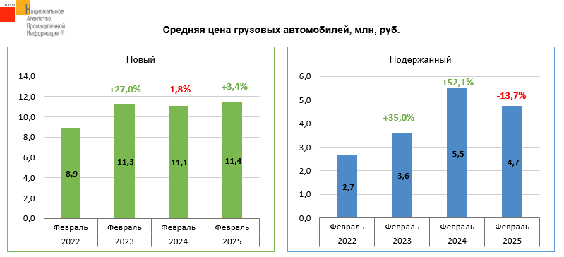 Маркетинговое агентство НАПИ проанализировало динамику средних цен на новые и подержанные* грузовые автомобили. Средняя цена на новый грузовик в феврале 2025 года достигла 11,4 млн. руб., что в 1,3 раза больше, чем в феврале 2022 года. Средняя цена на подержанный грузовик в феврале 2025 года составила 4,7 млн. руб., что в 1,8 раза больше, чем в феврале 2022 года. По сравнению же с февралем прошлого года средняя цена на подержанный грузовой автомобиль снизилась на 13,7%.