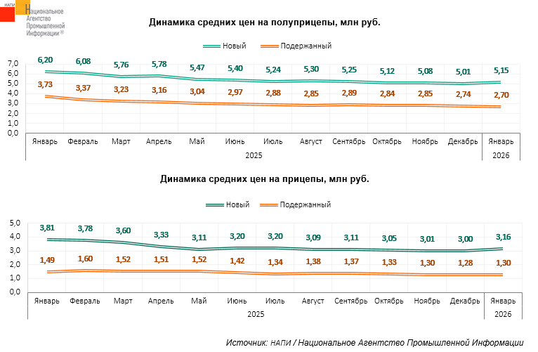 Маркетинговое агентство НАПИ проанализировало динамику средних цен на новые и подержанные* прицепы и полуприцепы. За год, с января 2025 года по январь 2026 года, стоимость прицепов и полуприцепов снизилась. Так, средняя цена на новые полуприцепы снизилась на 16,8%, а на подержанные – на 27,6%. Средняя цена на новые прицепы сократилась на 17,0%, на подержанные – на 13,2%.