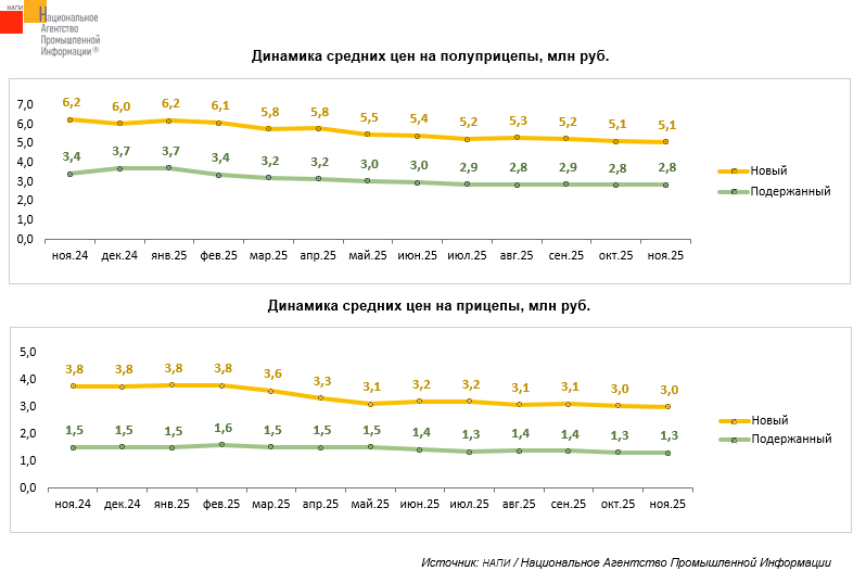 Маркетинговое агентство НАПИ проанализировало динамику средних цен на новые и подержанные* прицепы и полуприцепы. За год, с ноября 2024 по ноябрь 2025 года, стоимость прицепов и полуприцепов снизилась. Так, средняя цена на новые полуприцепы снизилась на 18,6%, а на подержанные – на 16,6%. Средняя цена на новые прицепы сократилась на 19,9%, на подержанные – на 14,0%. За месяц, с октября по ноябрь 2025 года, средняя цена на новые полуприцепы снизилась на 0,7% до 5,1 млн рублей, а на подержанные полуприцепы выросла на 0,2% до 2,8 млн рублей. Средняя стоимость новых прицепов сократилась на 1,1% до 3,0 млн рублей, а подержанных – на 2,4% до 1,3 млн рублей.