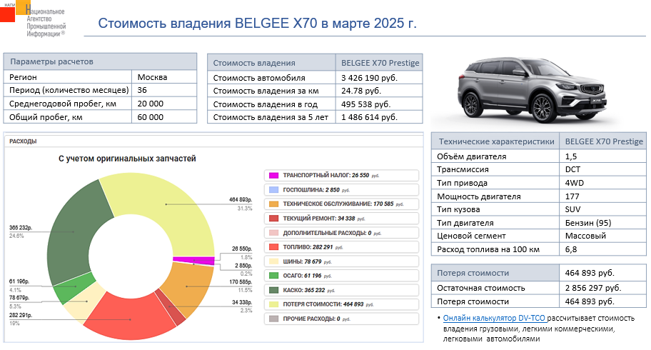 Маркетинговое агентство НАПИ проанализировало стоимость владения автомобилем марки BELGEE X70 за 3 (три) года физическим лицом в Москве, используя онлайн калькулятор стоимости владения DV – TCO.