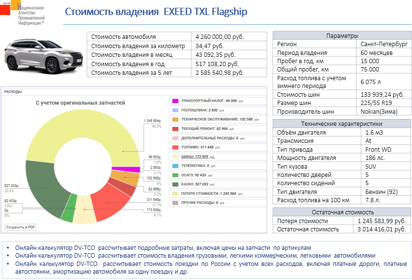 Маркетинговое агентство НАПИ (Национальное Агентство Промышленной Информации) проанализировало стоимость владения автомобиля EXEED TXL Flagship.