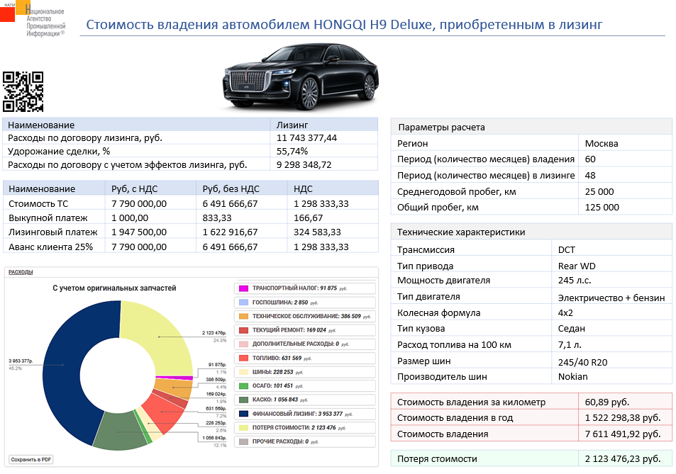 В качестве примера НАПИ рассчитало стоимость владения легковым автомобилем HONGQI H9 Deluxe, приобретенным в лизинг в корпоративном парке в городе Москва с использованием онлайн калькулятора стоимости владения DV – TCO.