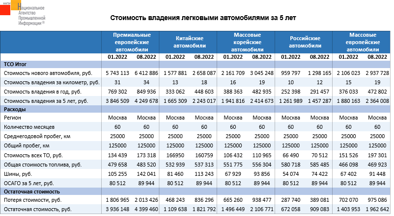 Маркетинговое агентство НАПИ (Национальное Агентство Промышленной Информации) проанализировало изменение стоимости владения новыми легковыми автомобилями в январе и августе 2022 года. За период с января по август стоимость владения на км пробега выросла среди всех рассматриваемых групп автомобилей. Меньше всего подорожала стоимость владения европейскими премиальными автомобилями(+9,7%). Больше всего выросла стоимость владения китайскими автомобилями (+38,5%).