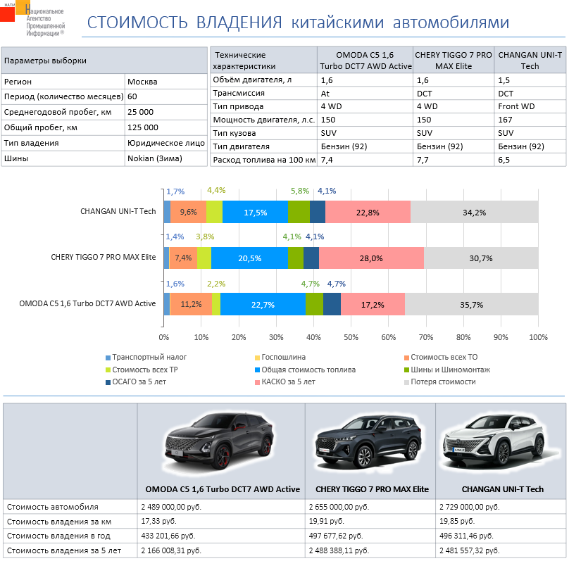 Маркетинговое агентство НАПИ (Национальное Агентство Промышленной Информации) проанализировало стоимость владения у юридических лиц китайскими автомобилями OMODA C5 1,6 Turbo DCT7 AWD Active, CHERY TIGGO 7 PRO MAX Elite,CHANGAN UNI-T Tech.