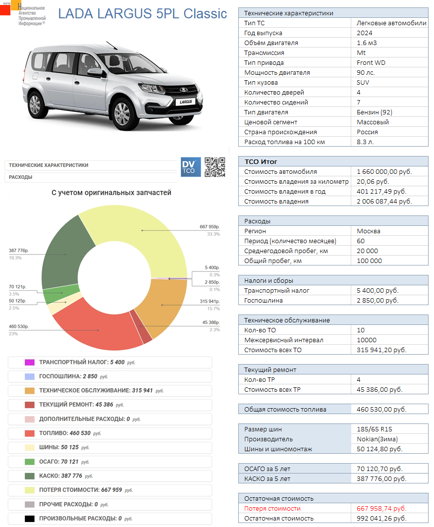 Маркетинговое агентство НАПИ (Национальное Агентство Промышленной Информации) проанализировало стоимость владения автомобилем LADA LARGUS 5PL Classic.