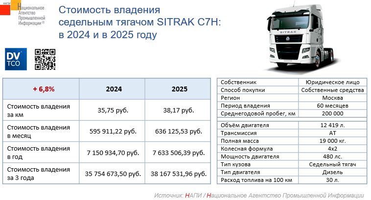 Маркетинговое агентство НАПИ сравнило стоимость владения седельным тягачом SITRAK C7H MAX 4×2 ZZ4186V391HE в 2024 и 2025 году. Расчет выполнен с использованием онлайн калькулятора стоимости владения DV – TCO.