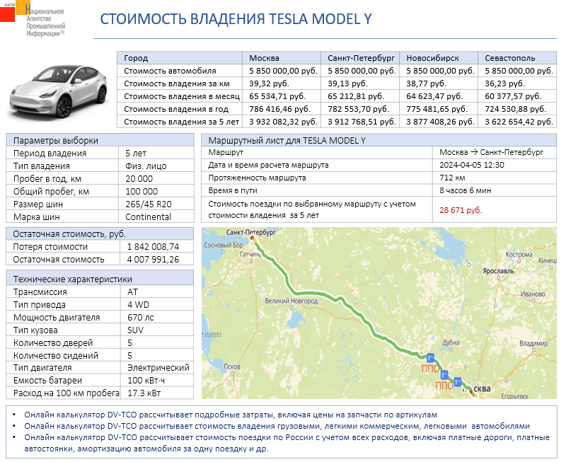 Маркетинговое агентство НАПИ (Национальное Агентство Промышленной Информации) проанализировало стоимость владения электромобилем TESLA MODEL Y.