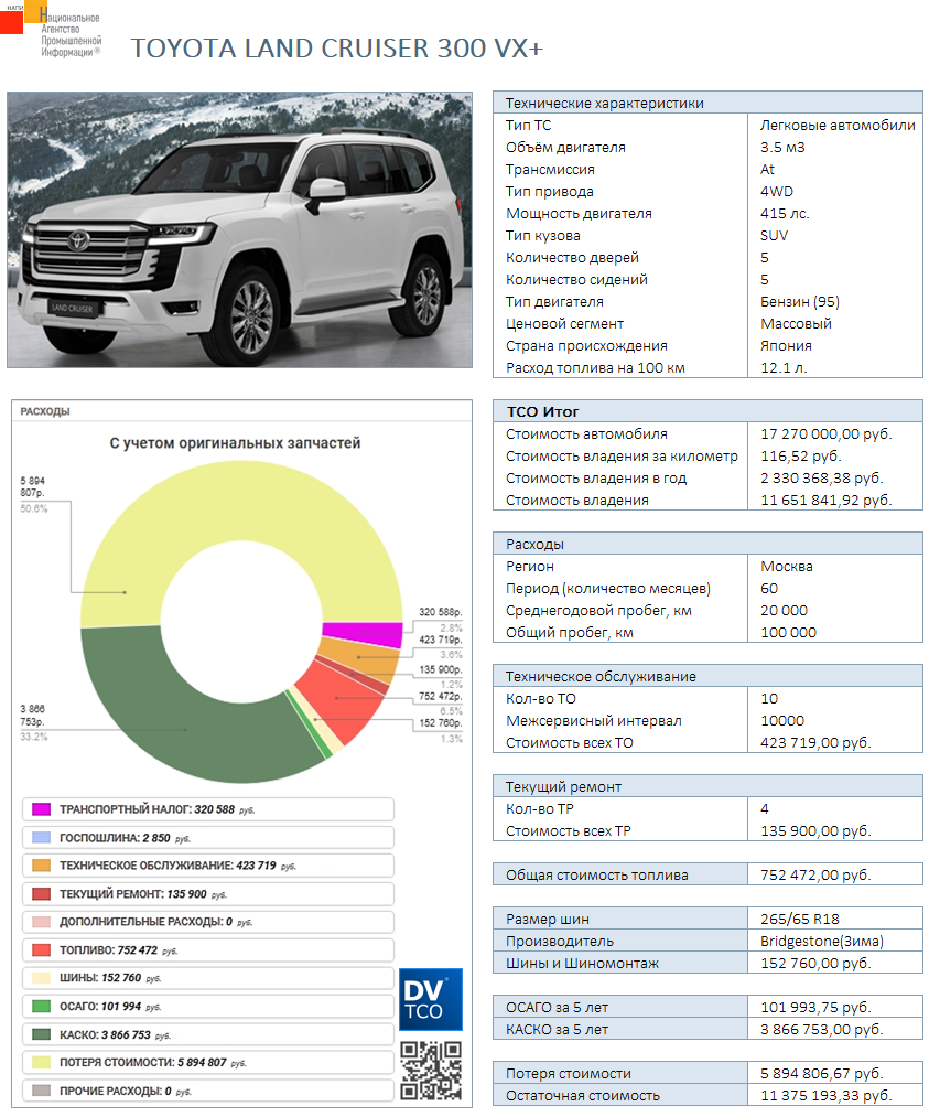 Маркетинговое агентство НАПИ (Национальное Агентство Промышленной Информации) проанализировало стоимость владения автомобилем TOYOTA LAND CRUISER 300 VX+.