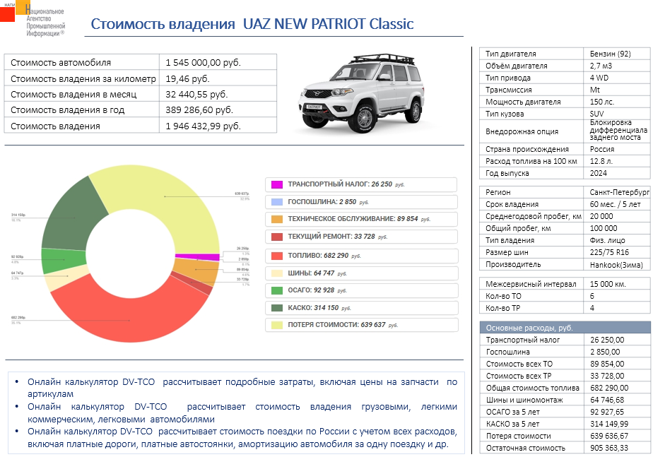 Маркетинговое агентство НАПИ (Национальное Агентство Промышленной Информации) проанализировало стоимость владения автомобилем UAZ NEW PATRIOT Classic.