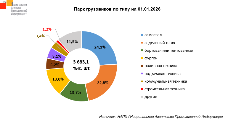 По данным маркетингового агентства НАПИ, в парке грузовых автомобилей* на 01.01.2026 г. насчитывается 3,7 млн единиц техники.