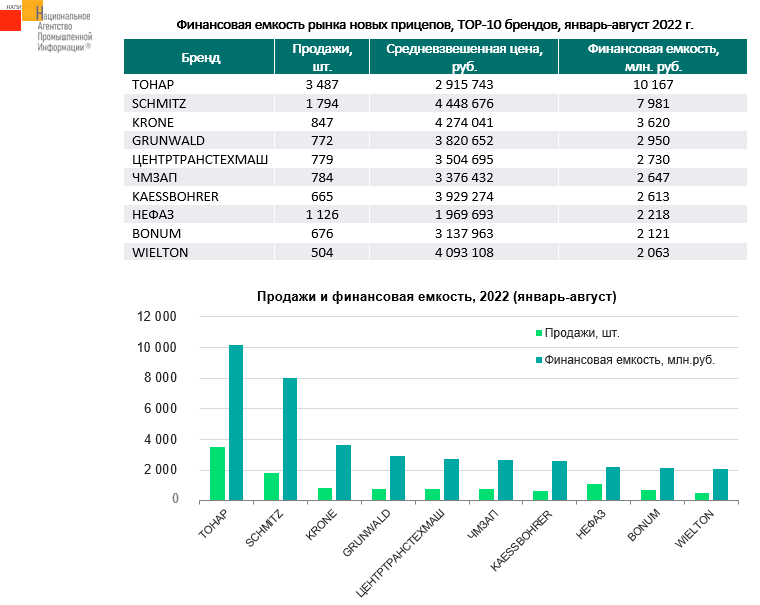 По данным маркетингового агентства НАПИ (Национальное Агентство Промышленной Информации) на рынке новых прицепов по итогам восьми месяцев текущего года ТОНАР лидирует по финансовой емкости с результатом в 10,2 млрд. руб.