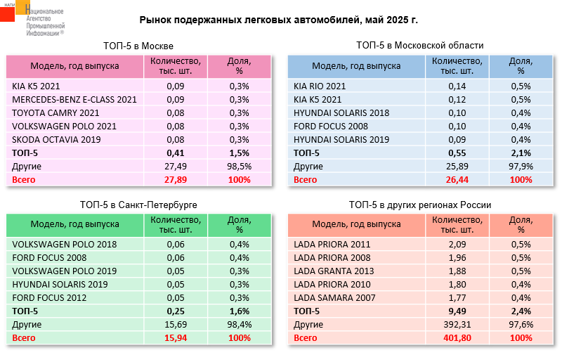 Маркетинговое агентство НАПИ проанализировало какие подержанные автомобили пользовались наибольшим спросом в различных регионах России в мае 2025 года. Так в пятерку лидеров в Москве не вошел ни один российский автомобиль, но вошел четырехлетний MERCEDES-BENZ E-CLASS. Кроме того, москвичи охотно покупали «свежие» автомобили, так в пятерке лидеров - четыре четырехлетних автомобиля. В Московской области в ТОП-5 также не вошел ни один российский автомобиль, четырехлетних автомобилей – всего два. Ни один премиальный автомобиль в пятерку лидеров не попал. В Санкт-Петербурге в пятерке лидеров также нет ни одного российского автомобиля, наибольшим спросом пользовались более возрастные иномарки массового ценового сегмента. В остальных регионах России лучше всего покупают «возрастные» российские автомобили. В пятерку лидеров не вошла ни одна иномарка, самому «молодому» автомобилю - двенадцать лет.