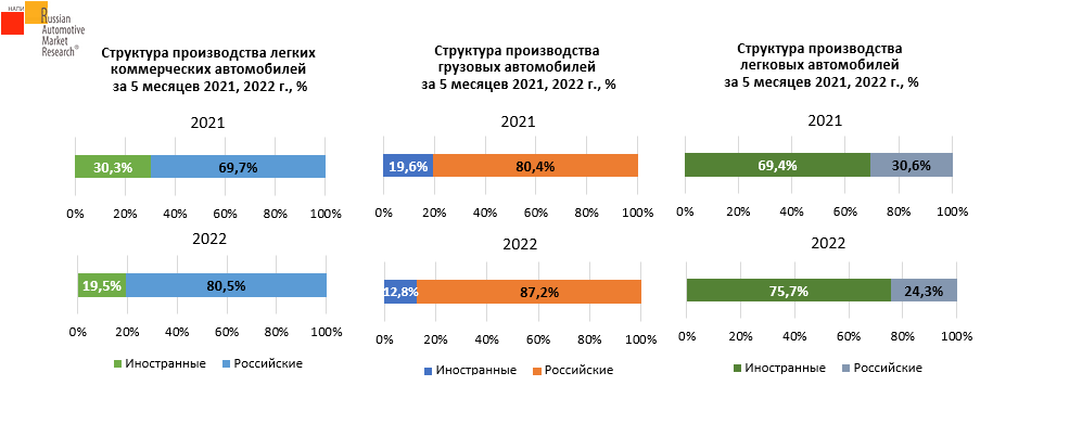 Согласно данным НАПИ (Национальное Агентство Промышленной Информации) за 5 месяцев 2022 года производство сократилось во всех сегментах, за исключением грузовых автомобилей российских брендов.