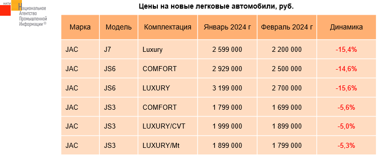 Маркетинговое агентство НАПИ проанализировало рекомендованные розничные цены (РРЦ) на новые легковые автомобили в феврале 2024 г. По сравнению с январем 2024 г. снизились цены на 6 комплектаций JAC от 5 до 15,6%. Ни один автопроизводитель в феврале цены не поднял.