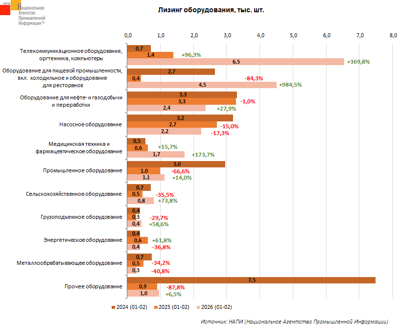 По данным маркетингового агентства НАПИ, за январь-февраль 2026 года в финансовый лизинг было выдано 21,4 тыс. ед. оборудования, что на 75,8% больше, чем годом ранее, когда было выдано 12,2 тыс. ед. При этом достичь показателей 2024 года (23,1 тыс. ед.) не удалось, результат первых двух месяцев текущего года ниже на 7,3%.