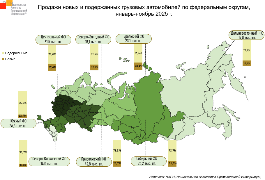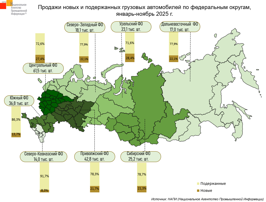 По данным маркетингового агентства НАПИ, за январь-ноябрь 2025 года было продано 239,3 тыс. новых и подержанных грузовых* автомобилей, что на 22,6% меньше, чем годом ранее, когда было реализовано 309 тыс. грузовиков. Так, продажи подержанной техники сократились на 4,5%, а новой упали на 53,3%.