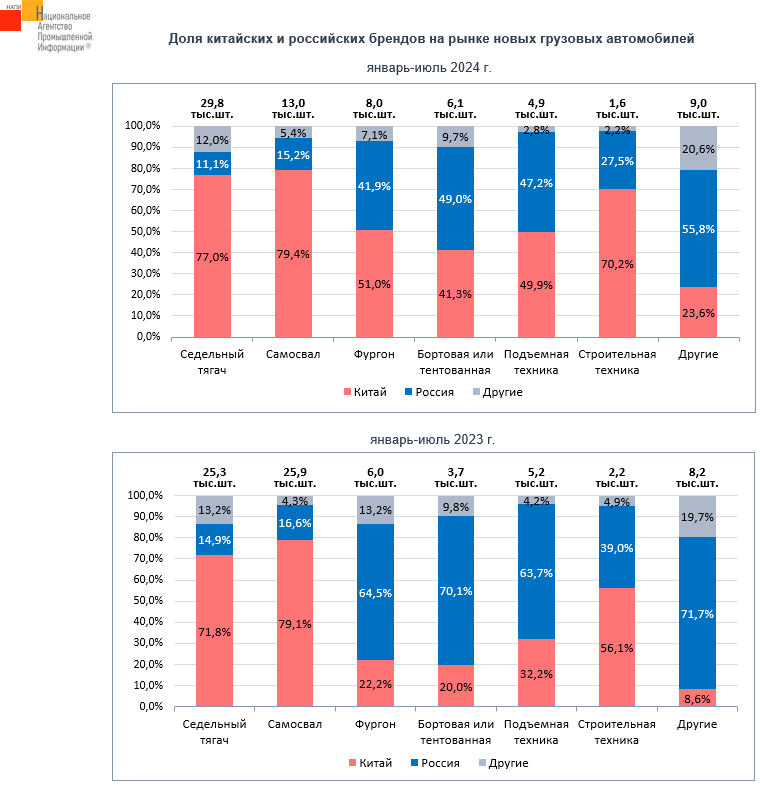 По данным маркетингового агентства НАПИ, по итогам января-июля 2024 г. доля китайской техники на рынке новых грузовых автомобилей достигла 63%. Годом ранее китайские грузовики занимали 58% рынка. В таких сегментах как самосвалы, седельные тягачи, строительная техника на долю китайских грузовых автомобилей приходится уже больше 70% продаж. Доля российских брендов за год сократилась с 32% до 27%.