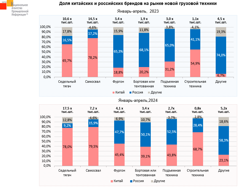 По данным маркетингового агентства НАПИ, по итогам января-апреля 2024 г. доля китайской техники на рынке новых грузовых автомобилей достигла 62,4%. Годом ранее китайские грузовики занимали 54,3% рынка. Наибольшим спросом китайская техника пользуется в сегментах седельных тягачей, самосвалов и строительной техники.
