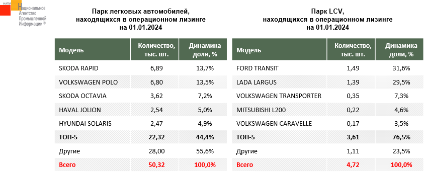 Маркетинговое агентство НАПИ проанализировало парк легковых автомобилей и легких коммерческих автомобилей (LCV), находящихся в операционном лизинге. Всего в операционном лизинге на 01.01.2024 г. находится 55,04 тыс. легковых и легких коммерческих автомобилей. Самый популярный легковой автомобиль в парке операционного лизинга — SKODA RAPID, доля которого составляет 13,7%. Самый популярный LCV - FORD TRANSIT, на долю которого приходится почти треть парка LCV, находящихся в операционном лизинге.