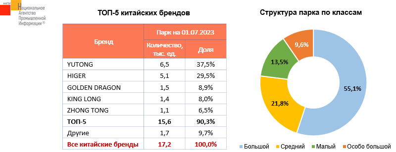 По данным маркетингового агентства НАПИ, парк китайских автобусов на 01.07.2023 г. насчитывает 17,2 тыс. шт. На долю китайских брендов приходится 3,6% российского автобусного парка. Больше половины эксплуатируемых в России китайских автобусов – большого класса. Самые популярные китайские бренды – YUTONG и HIGER, совокупно на их долю приходится 67% от всех китайских автобусов.