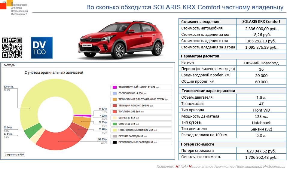 Маркетинговое агентство НАПИ проанализировало стоимость владения хэтчбеком SOLARIS KRX Comfort с использованием онлайн калькулятора стоимости владения DV – TCO.
