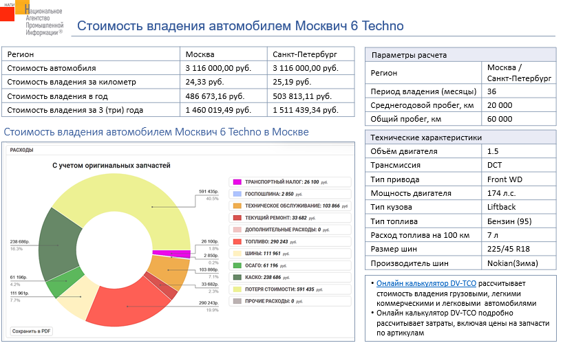 Маркетинговое агентство НАПИ проанализировало стоимость владения автомобилем Москвич 6 Techno у физического лица в Москве и Санкт-Петербурге с использованием онлайн калькулятора стоимости владения DV – TCO. Стоимость владения автомобилем рассчитана с учетом потери стоимости.