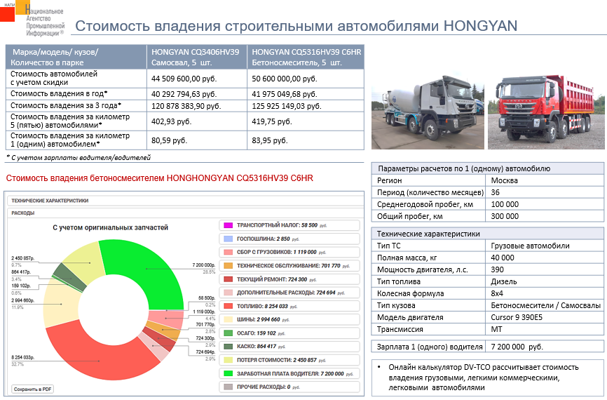 Маркетинговое агентство НАПИ проанализировало стоимость владения бетоносмесителями и самосвалами марки HONGYAN в корпоративном парке в Москве с использованием онлайн калькулятора стоимости владения DV – TCO. В стоимость владения включена потеря стоимости автомобиля и зарплаты водителей.