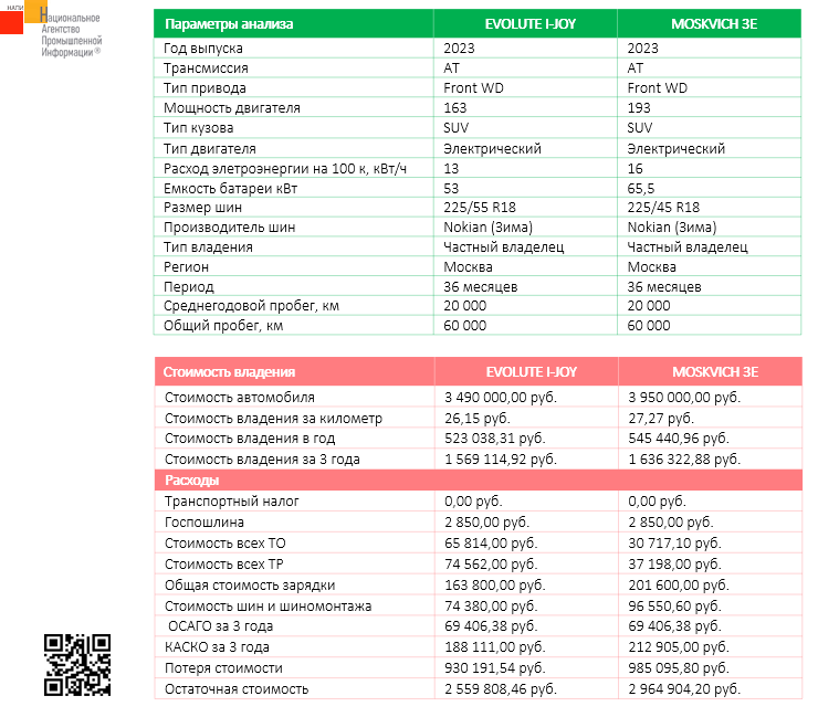 Маркетинговое агентство НАПИ (Национальное Агентство Промышленной Информации) проанализировало стоимость владения легковыми автомобилями EVOLUTE I-JOY и MOSKVICH 3E в сентябре в 2023 г. частным владельцем в течении 3 лет в Москве.