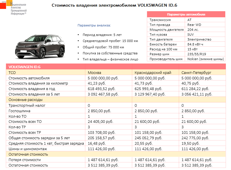 Маркетинговое агентство НАПИ (Национальное Агентство Промышленной Информации) проанализировало в декабре 2023г. стоимость владения электромобилем VOLKSWAGEN ID.6 в различных регионах России. Среди представленных в таблице регионов выгоднее всего владеть автомобилем в Санкт-Петербурге (40,75 руб. на км пробега), дороже всего обходится автомобиль в Краснодарском крае (41,73 руб. на км пробега).