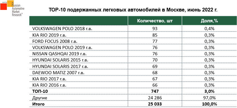 Согласно данным НАПИ (Национальное Агентство Промышленной Информации) в г. Москва в июне 2022 года было продано 25,0 тыс. подержанных легковых автомобилей, что в 4,2 раза больше, чем новых легковых автомобилей. Новых «легковушек» было реализовано 5,9 тыс.шт.