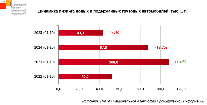 Стоит отметить, что на долю лизинга подержанных грузовых автомобилей в январе-октябре 2022-2024 года приходилось лишь 20%-26%, тогда как за 10 месяцев 2025 года доля лизинга подержанной техники достигла 52,6%.