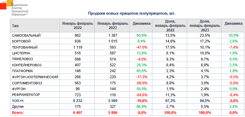 По данным маркетингового агентства НАПИ, продажи новых прицепов-полуприцепов за первые два месяца текущего года сократились на 8%. Существенно изменилась и структура рынка, в текущем году продажи самосвальной прицепной техники выросли на 60,9%, благодаря чему доля этого сегмента достигла почти четверти. Вторую строчку рейтинга, как и в прошлом году, заняли бортовые прицепы-полуприцепы, которые нарастили долю до 17,2%. Продажи тентованной техники упали на 47%, как результат по итогам двух месяцев текущего года этот сегмент опустился на третью строчку, тогда как по итогам января-февраля прошлого года тентованные прицепы-полуприцепы заняли первое место с большим отрывом.