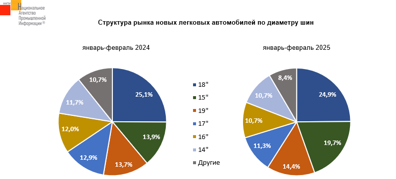 Маркетинговое агентство НАПИ проанализировало продажи новых легковых автомобилей по диаметру шин. В январе-феврале 2025 года на 5,8% выросла доля автомобилей с шинами 15“ за счет запуска продаж автомобилей SOLARIS, LADA LARGUS и роста продаж автомобилей LADA VESTA.