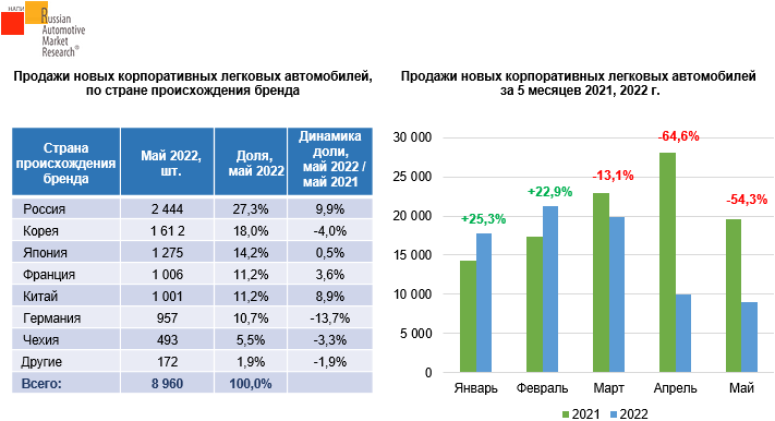 Всего за первые пять месяцев 2022 г. было продано 77,9 тыс. новых корпоративных легковых автомобилей. Рынок корпоративных автомобилей сократился на 23,7% по сравнению с аналогичным периодом прошлого года, когда было реализовано 102,2 тыс. автомобилей.