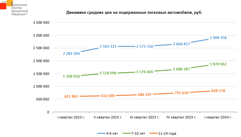 Маркетинговое агентство НАПИ проанализировало динамику средних цен на подержанные легковые автомобили с 1 квартала 2023 года по 1 квартал 2024 года. По сравнению с 4 кварталом прошлого года средние цены на автомобили возрастом 4-6 лет выросли на 9,1%, на автомобили возрастом 7-10 лет - на 11,3%. Автомобили возрастной категории 11-24 года подорожали на 10,9%.