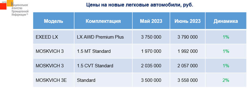 Маркетинговое агентство НАПИ проанализировало рекомендованные розничные цены (РРЦ) на новые легковые автомобили в июне 2023 г. За месяц цены выросли всего на 4 комплектации, в т.ч. на электромобиль MOSKVICH 3E в комплектации Standard. Основной пик подорожания пришелся на апрель-май, так в апреле относительно марта выросли цены на 60 комплектаций, в мае относительно апреля - на 61 комплектацию.