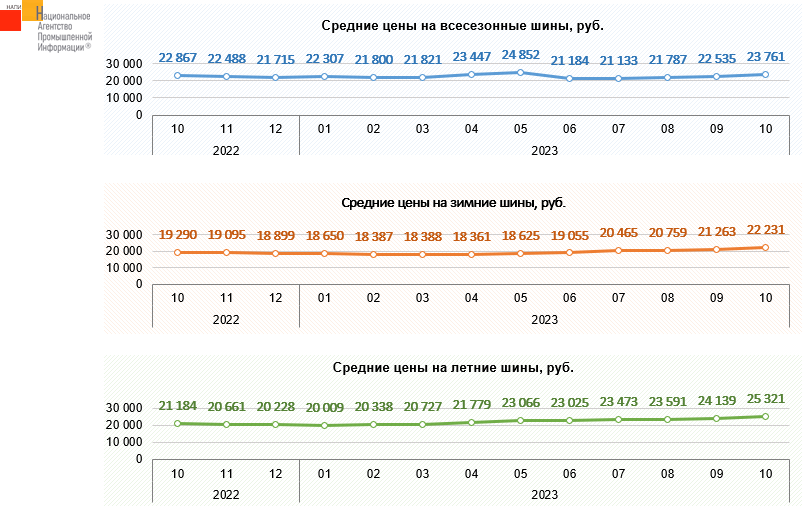 Маркетинговое агентство НАПИ проанализировало динамику средних цен на новые шины премиального ценового сегмента для легковых автомобилей. За один месяц (с сентября по октябрь 2023 г.) всесезонные шины подорожали на 5,4%, зимние – на 4,6%, летние - на 4,9%.