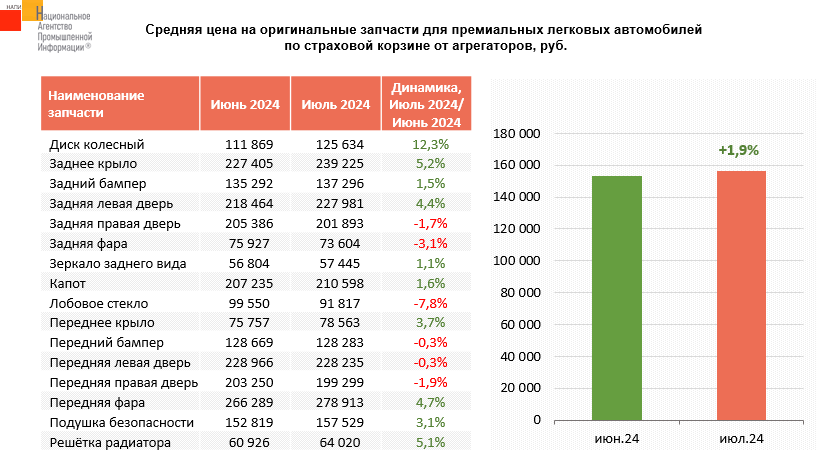 Маркетинговое агентство НАПИ проанализировало цены на оригинальные запчасти по страховой корзине для премиальных некитайских легковых автомобилей от агрегаторов. В июле текущего года по сравнению с июнем средняя цена на оригинальные запчасти выросла на 1,9%.