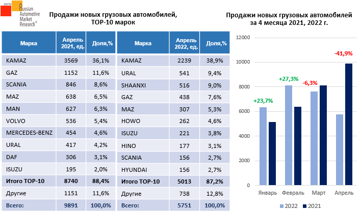 Согласно данным Russian Automotive Market Research за первые четыре месяца 2022 г. было продано 27,9 тыс. новых грузовых автомобилей, в прошлом году за 4 месяца было реализовано 29,6 тыс. грузовиков, рынок сократился на 5,7% по сравнению с аналогичным периодом прошлого года. В марте текущего года продажи новых грузовиков снизились на 6,3%, а в апреле - почти на 42%. По итогам апреля в ТОР-10 из «европейской семерки» попал только один бренд – SCANIA. В апреле прошлого года 5 брендов из «европейской семерки» вошли в ТОР-10.