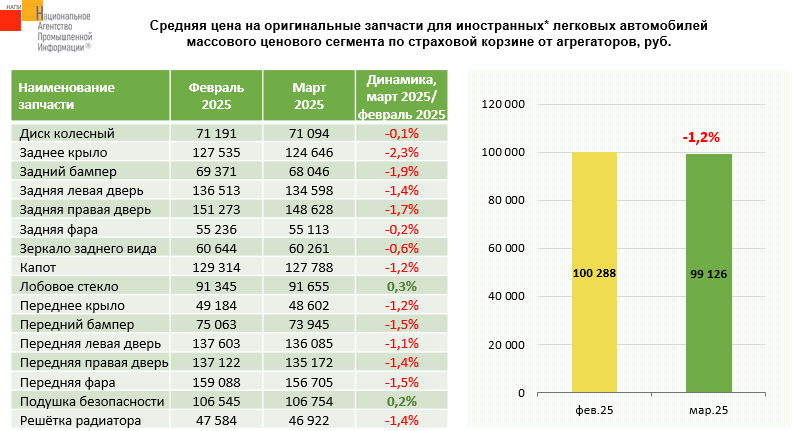 Маркетинговое агентство НАПИ проанализировало цены на оригинальные запчасти по страховой корзине для иностранных* легковых автомобилей массового ценового сегмента от агрегаторов. В марте 2025 года по сравнению с февралем 2025 года средняя цена на оригинальные запчасти снизилась на 1,2%.