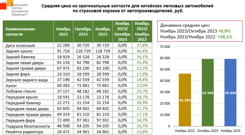 Маркетинговое агентство НАПИ проанализировало цены на оригинальные запчасти по страховой корзине для китайских легковых автомобилей от автопроизводителей. В ноябре по сравнению с октябрем текущего года средняя цена на оригинальные запчасти не изменилась. За год же запчасти для китайских автомобилей подорожали на 28,1%.