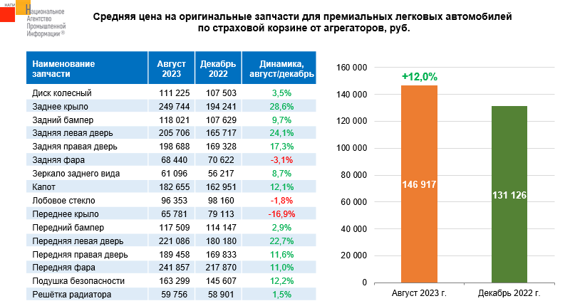 Маркетинговое агентство НАПИ проанализировало цены на оригинальные запчасти по страховой корзине для премиальных легковых автомобилей от агрегаторов. За восемь месяцев текущего года средняя цена на оригинальные запчасти выросла на 12%.