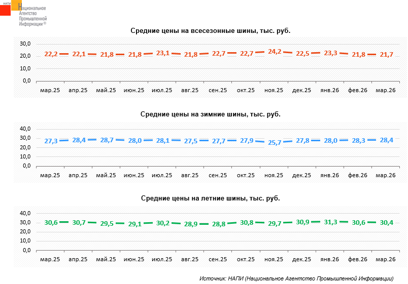 Маркетинговое агентство НАПИ проанализировало динамику средних цен на новые шины премиального ценового сегмента для легковых автомобилей. За год, с марта 2025 по март 2026 года, средняя цена на всесезонные шины сократилась на 2,3%, на летние – на 0,6%. В то же время зимние шины подорожали на 4,2%.