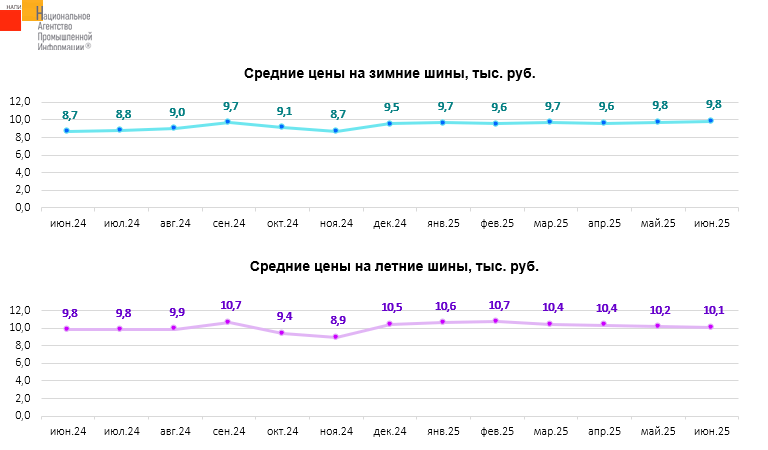 Маркетинговое агентство НАПИ проанализировало динамику средних цен на новые шины не премиального ценового сегмента для легковых автомобилей. За год, с июня 2024 по июнь 2025 года, средняя цена на зимние шины выросла на 13,3%, летние шины подорожали на 2,6%