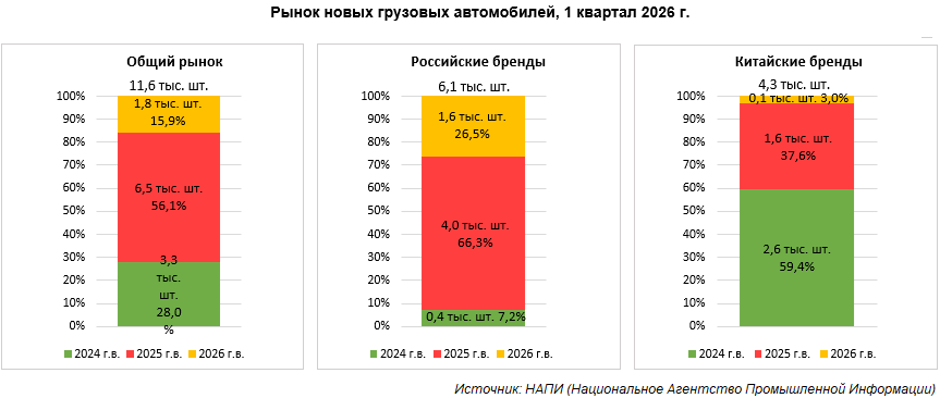 В целом, хорошие продажи новой техники в 2022-2024 годах и неплохие показатели 2025 года будут оказывать давление на рынок и в 2026, и в 2027 годах. Во-первых, на рынок продолжает выходить досрочно возвращенная и изъятая «свежая» техника, предлагаемая с существенным дисконтом. Во-вторых, компании, приобретшие новую технику в упомянутые годы и не избавившиеся от нее, продолжат ее эксплуатировать, поскольку обновлять или расширять свой парк им экономически нецелесообразно. В-третьих, дилеры еще не распродали стоки новой техники 2024-2025 г.в. Ситуация в первом квартале 2026 года выглядит следующим образом: в продажах новых китайских грузовиков техника 2024 г.в. заняла 59,5%, 2025 г.в. – 37,6%, на технику, выпущенную в 2026 году, пришлось менее 3%. Интересно отметить, что в продажах российской техники машины 2024 г.в. заняли всего 7,2%. На российские грузовики 2025 г.в. пришлось 66,3%, и 26,5% пришлось на машины, выпущенные в 2026 году.