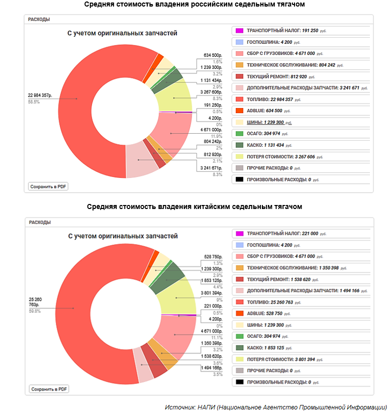 В сложных экономических условиях более реалистичным вариантом оказывается эксплуатация российской техники: цена на новый грузовик ниже, а значит меньше сумма ежемесячного лизингового платежа, дешевле сервис и ремонт. Так, средняя стоимость владения российским седельным тягачом составляет порядка 44 рубля за км пробега при пятилетнем сроке владения без учета стоимости лизинга, а китайским тягачом – порядка 47 рублей за км пробега. Кроме того, российская техника попадает под меры господдержки, поэтому владельцы существенно реже избавляются от «свежих» российских грузовиков, чем от более дорогих в эксплуатации китайских.