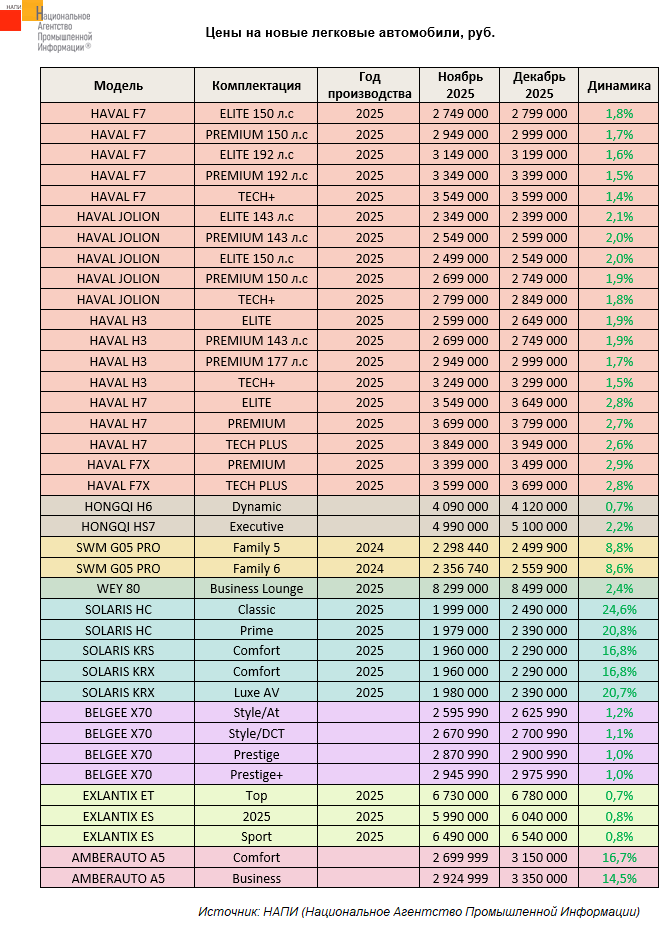 В цене выросли комплектации моделей HAVAL, HONGQI, SWM, WEY, SOLARIS, BELGEE, EXLANTIX и AMBERAUTO. Прирост составил от 0,7% до 24,6%.