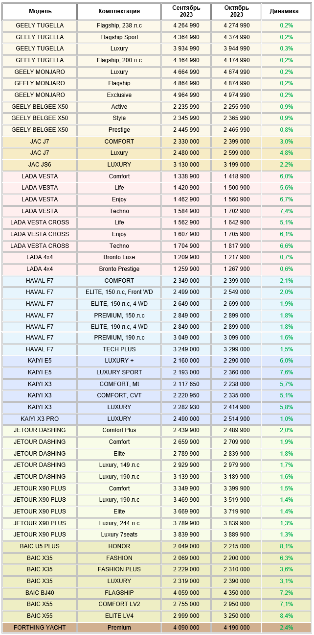 Маркетинговое агентство НАПИ проанализировало рекомендованные розничные цены (РРЦ) на новые легковые автомобили в октябре 2023 г. В октябре по сравнению с сентябрем выросли цены «всего» на 53 комплектации, автомобили подорожали на 0,2-8,4%. Интересно отметить, что в сентябре по сравнению с августом подорожала 81 комплектация, в августе по сравнению с июлем – 127 комплектаций.