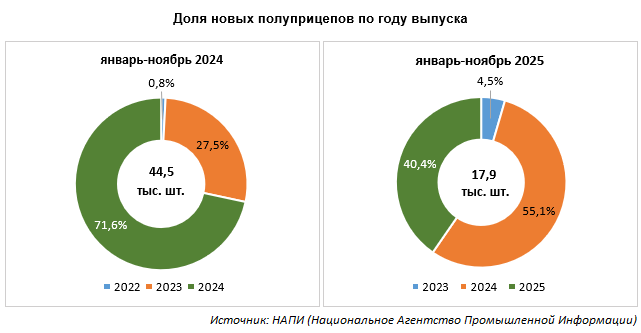 Продажи новых полуприцепов и тягачей по году выпуска в январе-ноябре 2025 года схожи. Основной объем продаж приходится на технику 2024 г.в. Доля техники того же года выпуска в продажах значительно сократилась, а техники 2023 г.в., напротив, выросла.